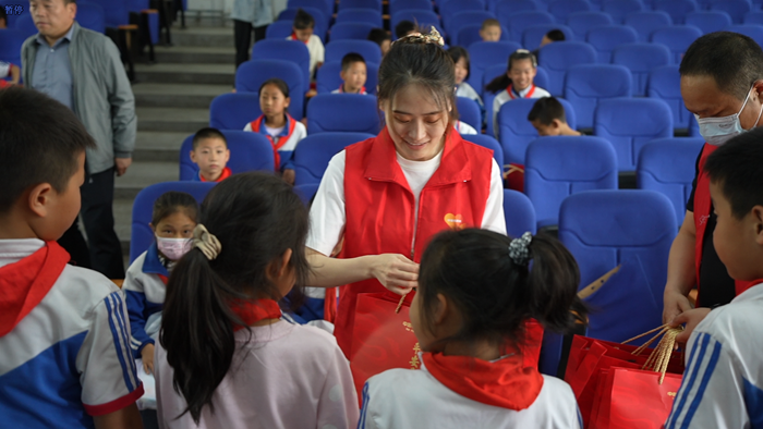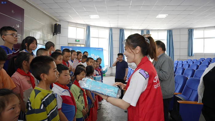 捐赠过程中,孩子们也满怀感激之情依次上台领取爱心捐资物,孩子们双手接过捐资物品行队礼,志愿者嘱咐孩子们要懂得分享,学会分享,独乐乐不如众乐乐。