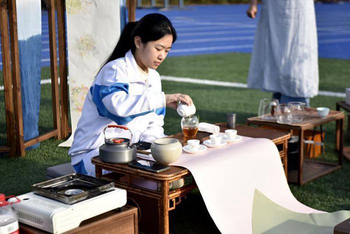 随后的茶艺表演环节,更是将现场气氛推向高潮。茶艺课成员端坐如莲,行云流水间尽显茶道雅韵:银练般的热水倾入杯盏,氤氲水汽裹着茶香升腾;茶叶如翡翠跃入壶中,注水间茶叶如游鱼翻腾;金绸般的茶汤精准分入瓷杯,顷刻间茶香漫溢操场,沁人心脾。
